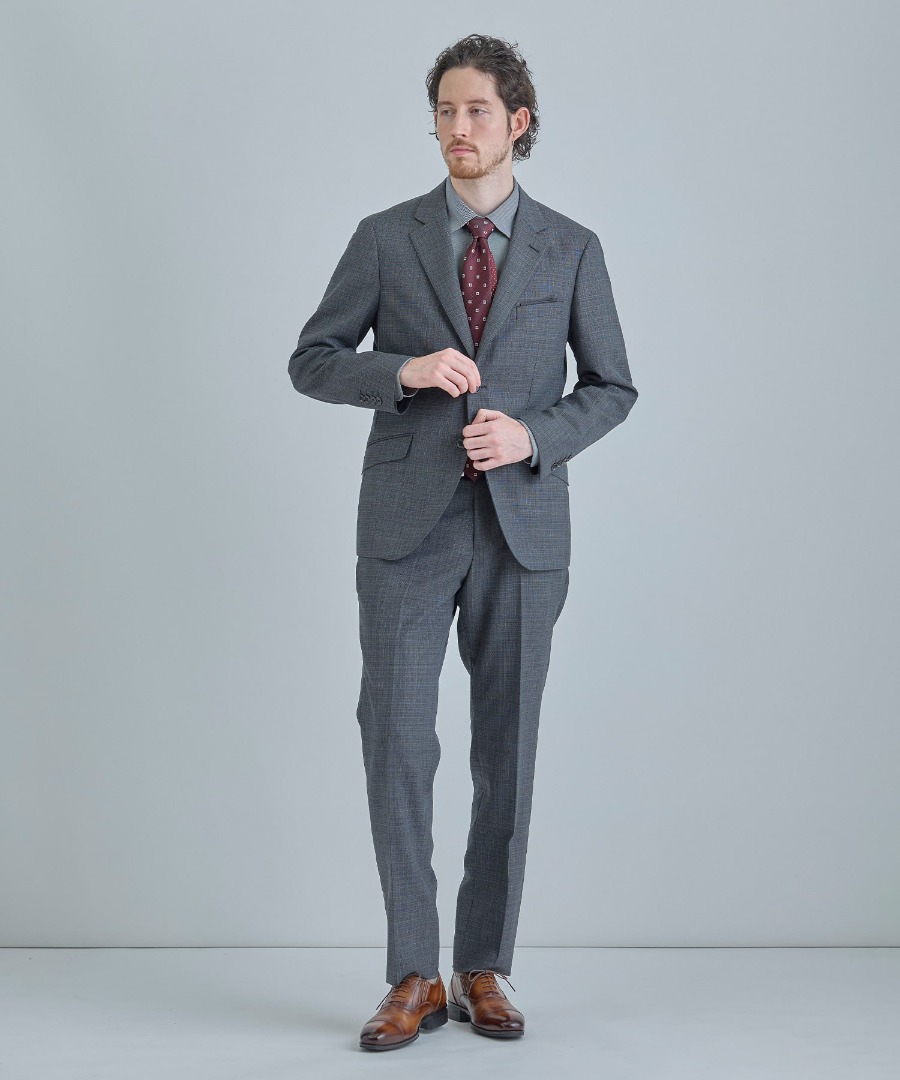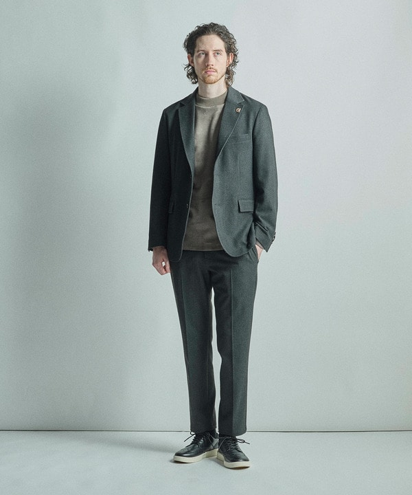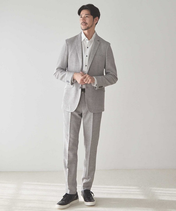 落ち着いたトーンのグレージャケットに、セットアップパンツを合わせた統一感のあるスタイル。