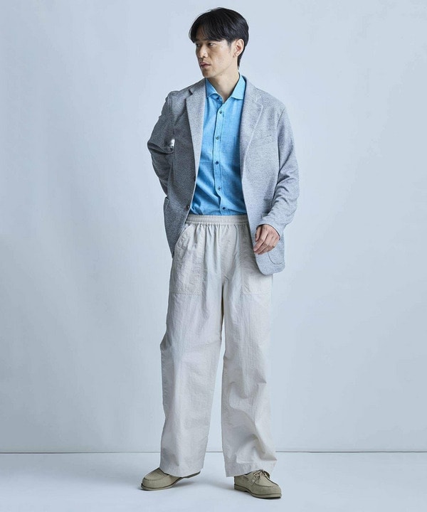 グレーのジャケットに、鮮やかなブルーのシャツとホワイト系のワイドパンツを合わせた爽やかなコーディネート。