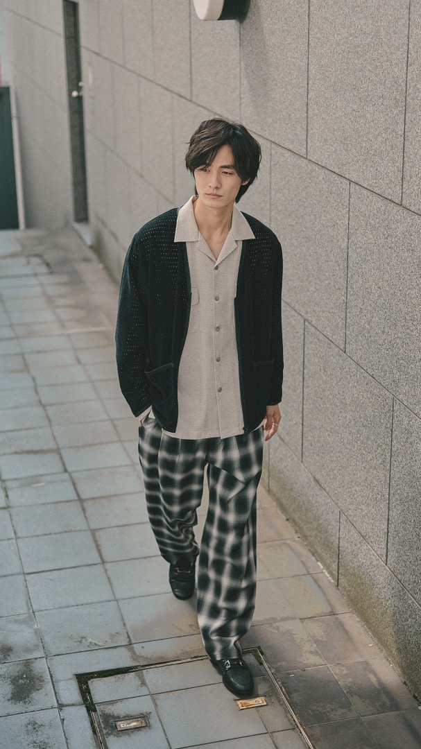 週の真ん中は、遊び心を取り入れて。オーバーサイズのグレーニットカーディガンと、ミディ丈のブラックスカートで、バランスの取れたシルエットを。