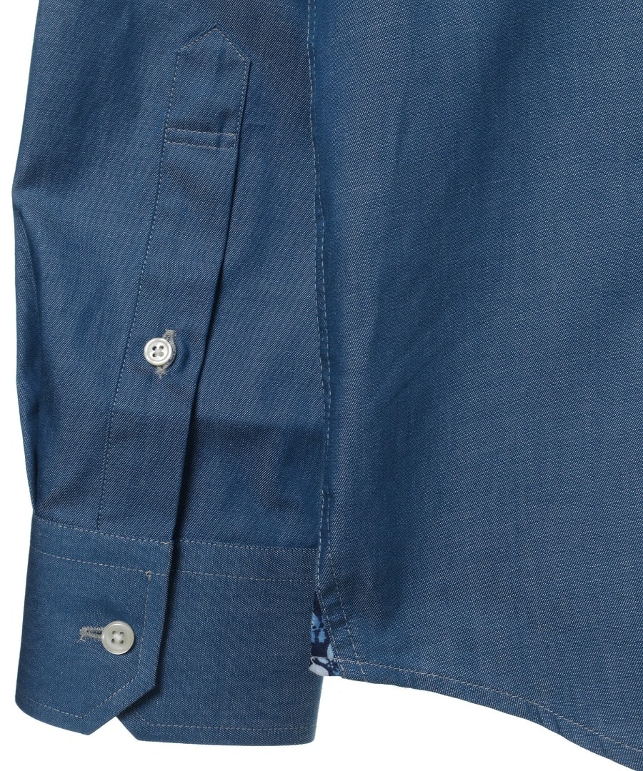 カジュアルになりがちなデニム調シャツですが、シャンブレー加工によって品のあるツヤを加え、爽やかさを保ちつつも落ち着いた大人の雰囲気を演出します。ヨーク裏、カフス裏、脇ピースに施された草花柄の別生地がアクセントに。