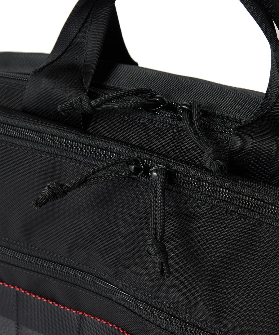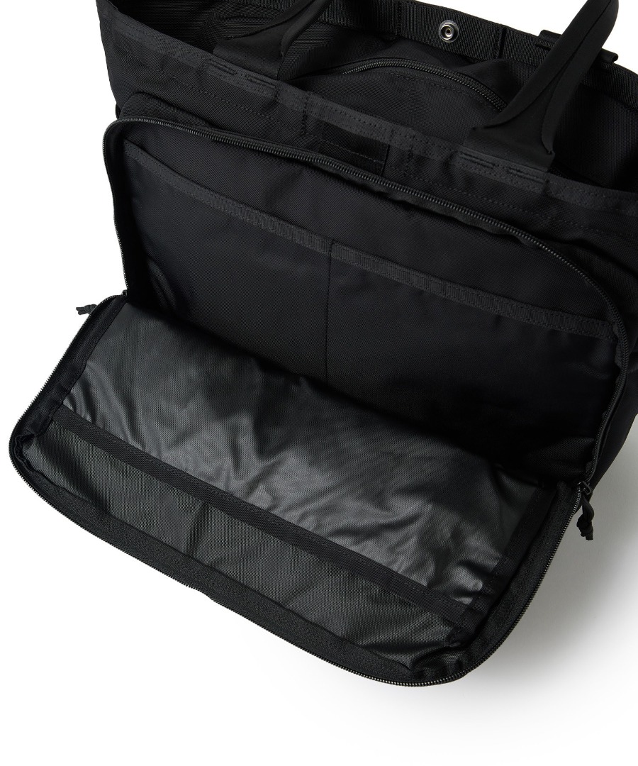 三層構造と計10個の収納スペースにより、PCや書類、ガジェット類を効率よく整理できる高機能トート。軽量ながらレザーライクな上質感を備え、肩への負担を軽減する快適な持ち心地も魅力です。撥水性に優れ、天候を問わず使えるデイリー仕様に加え、別注によるミニマルな表情と自立性を高めた底ビョウで、実用性と美しさを両立した一品に仕上げています。