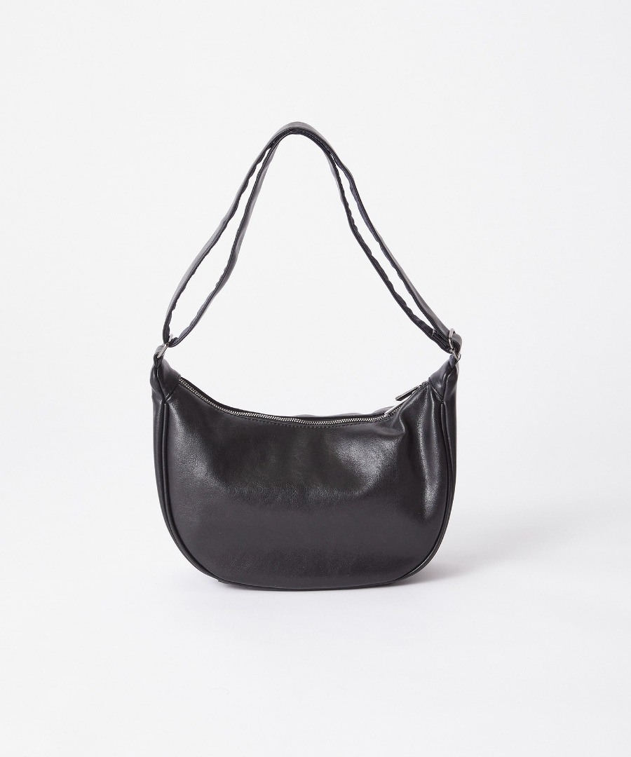 持ち手から本体まで一体感のあるカーブラインが、肩掛けした際もシルエットを崩さず、身体に沿うようにフィットするショルダーバッグ。上品な光沢のメタリックファスナーと、リアルレザーのような質感の合成皮革が洗練された印象を演出します。広めのマチで収納力も確保しつつ、自立する設計で置いた姿まで美しい、デザイン性と実用性を兼ね備えた一品です。