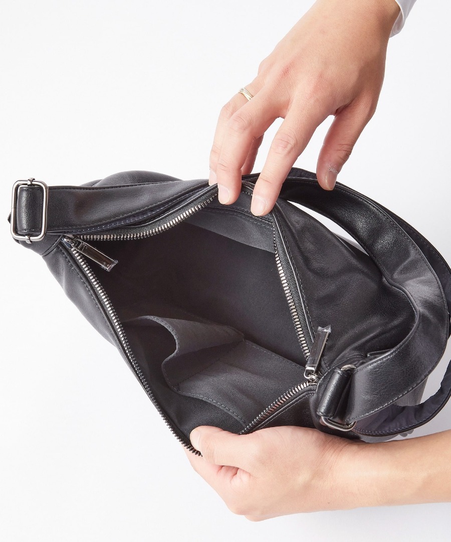 奥行きのあるムラ色レザーが、シンプルな佇まいに豊かな表情を与える大人のためのバッグ。背面から本体へ直接アクセスできるポケットを備え、口折れデザインの使いにくさを解消した実用設計です。長財布も収まる程よいサイズ感に、クラッチとショルダーの2WAY仕様で、シーンに応じたスマートな持ち方を叶えます。