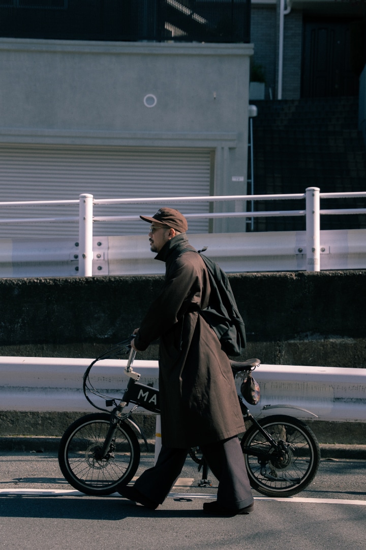 自転車移動なんですが、あえてロングコートをチョイス。