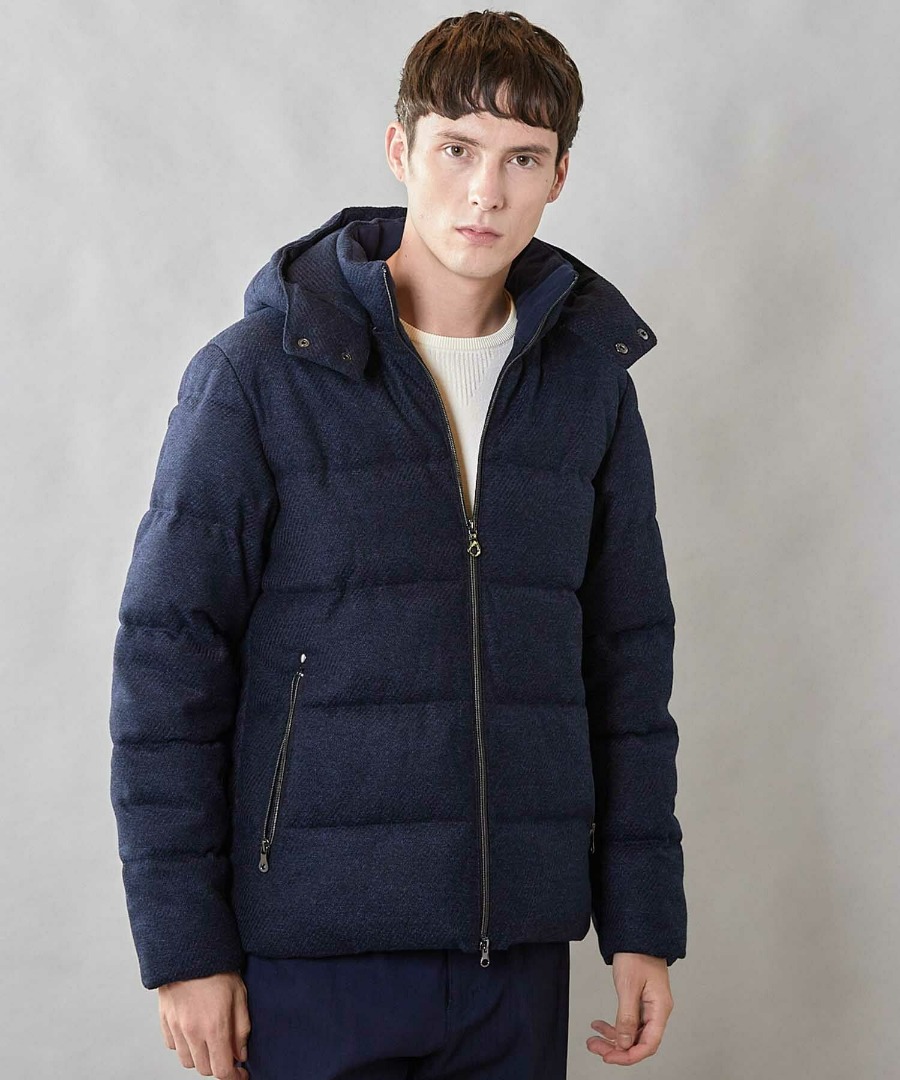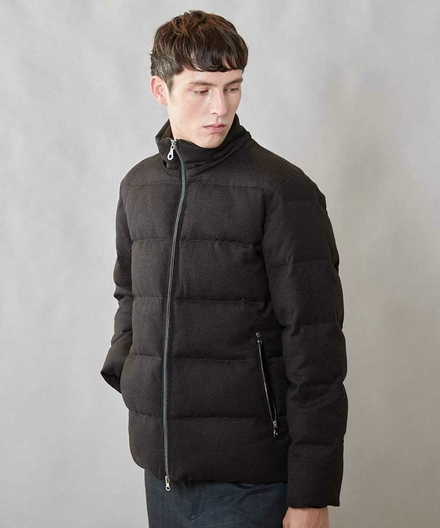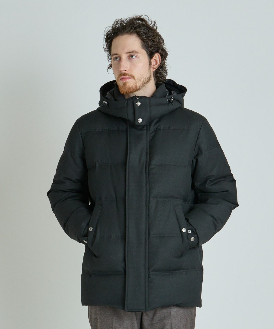 ウール調のメランジカルゼ素材を使用した、品の良さと機能性を兼ね備えたフード着脱式スタンド中綿ブルゾン。