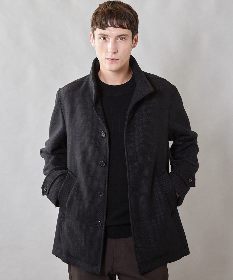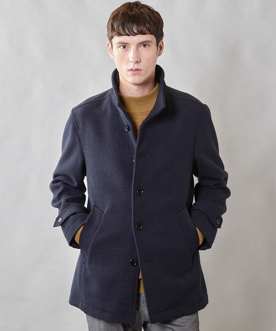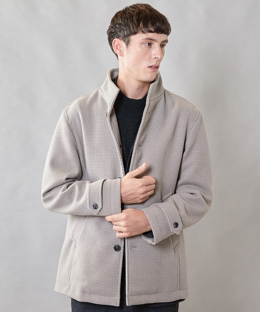 クラシックなヘリンボーン柄を、モダンなデザインで仕上げた上品なスタンドコート。
