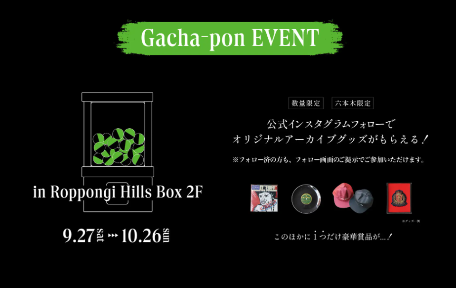 会期中は、1980年代から2000年代にかけて実際に制作されたMEN’S BIGIのノベルティ(非売品)が当たる特別イベントを開催。ブランド公式Instagramをフォロー、またはフォロー画面をご提示いただくと、1回ガチャガチャを回すことができ、当時の希少なアイテムを手に入れるチャンスです。さらに、その中には1つだけ豪華50周年記念アイテムも封入。過去から未来へと続くMEN’S BIGIの歩みを体感できる、特別な機会となっています。