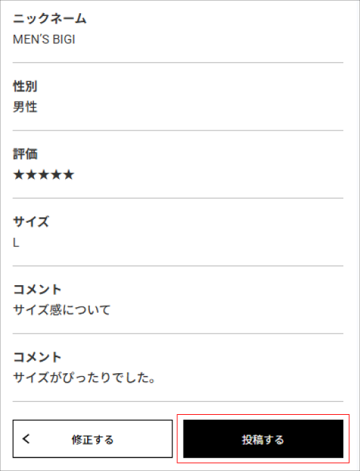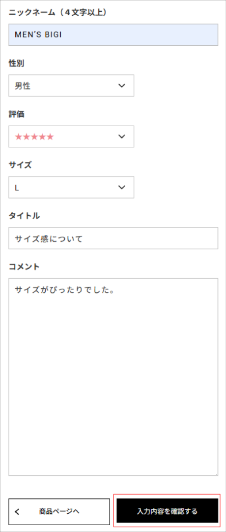 「コメント」は着用時の感想などを入力ください。