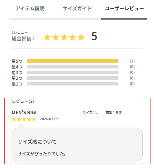レビューは、実際に着用した感想を記載し紹介できる機能です。
