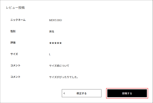 ・入力内容に誤りが無ければ「投稿する」をクリックします。これでレビュー投稿完了です。